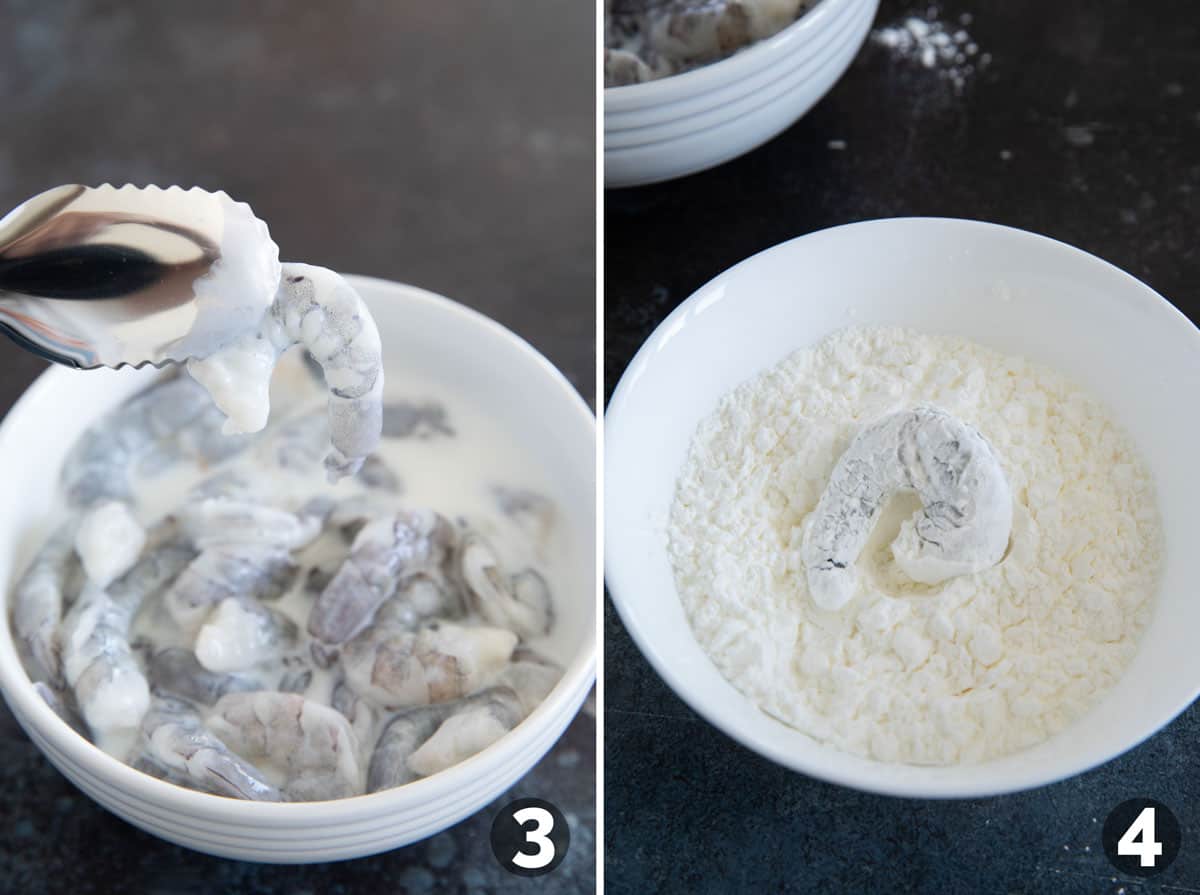 STEP 3: Working with one shrimp at a time, remove the shrimp from the buttermilk and let the excess buttermilk drip off. I find this is easiest with a pair of tongs.