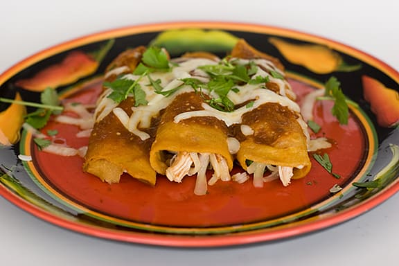 Fill the tortillas with the shredded chicken and extra salsa. Top the chicken with some cheese, chopped onion, and cilantro. Roll the tortillas and top with a little more cheese and sauce. Place plate under the broiler for a few seconds if you want the cheese melted. Serve.