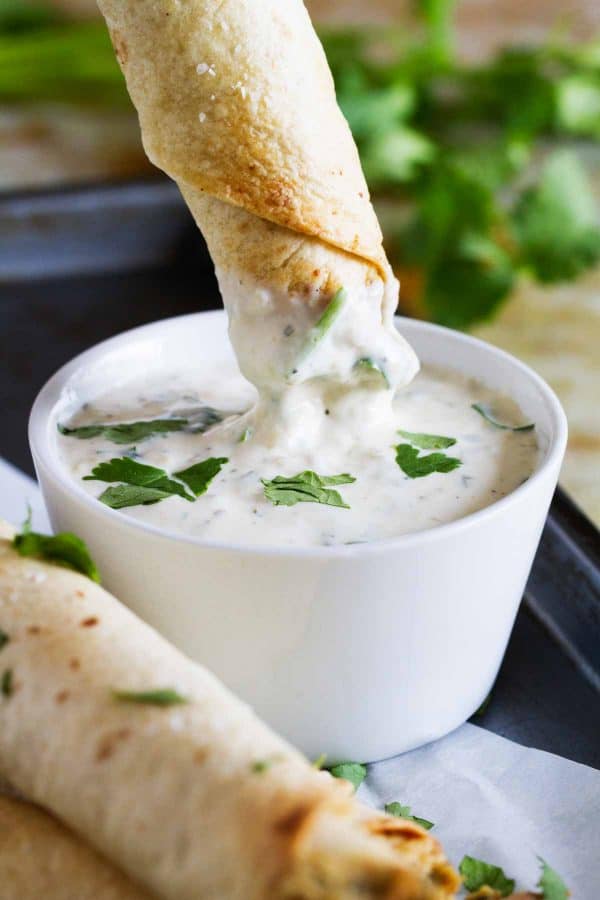 - Let the flautas cool for 5-10 minutes, then serve with the Creamy Cilantro-Lime Ranch Dressing.