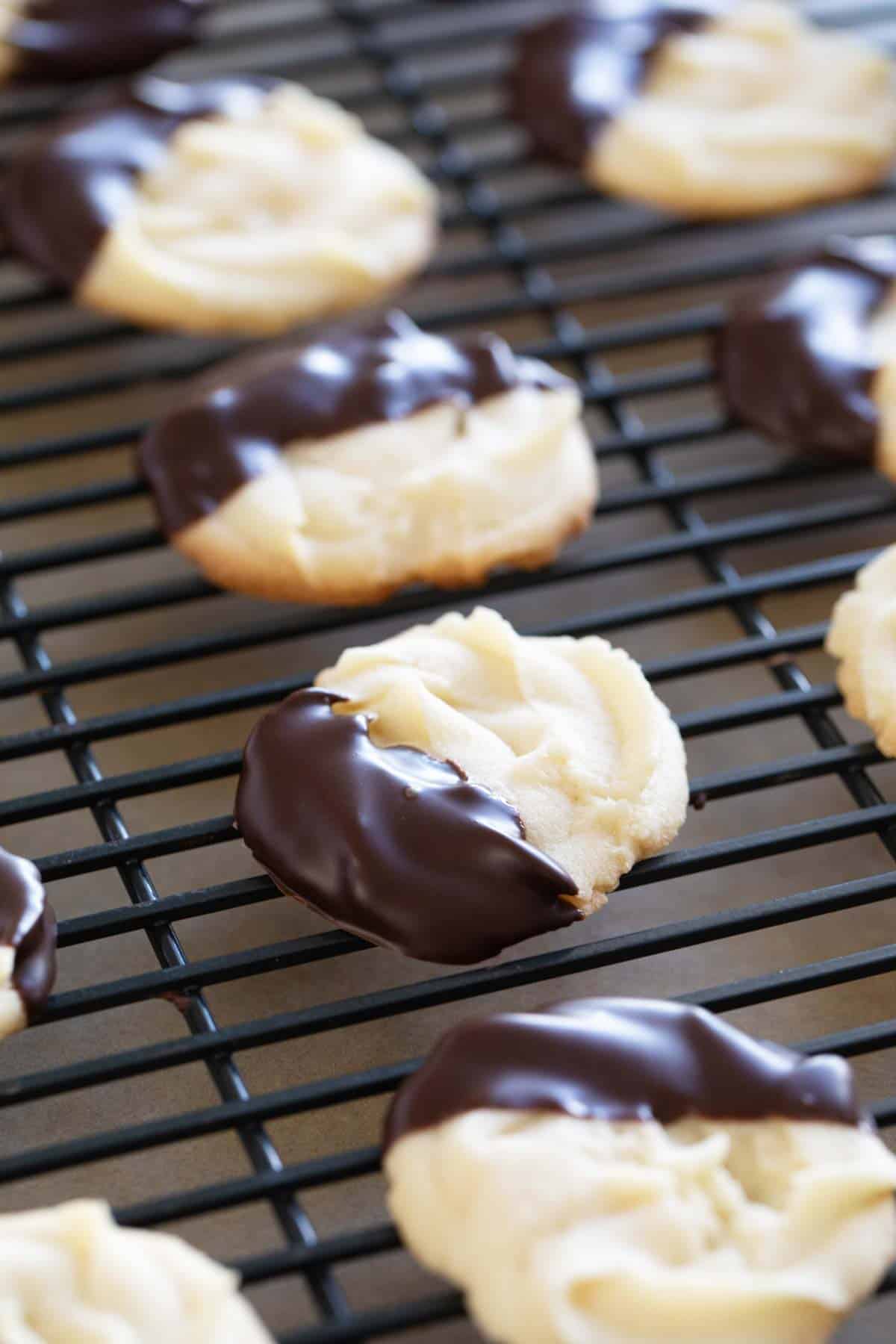 If these cookies are not baked long enough, they will be hard to dip in the chocolate because they will just break and fall apart. They are a delicate cookie, anyway, but you will want to make sure that they aren’t too soft.