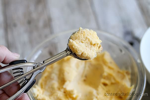 Start by making 1-inch balls with the mashed potatoes. I think this is easiest when you use a scoop.