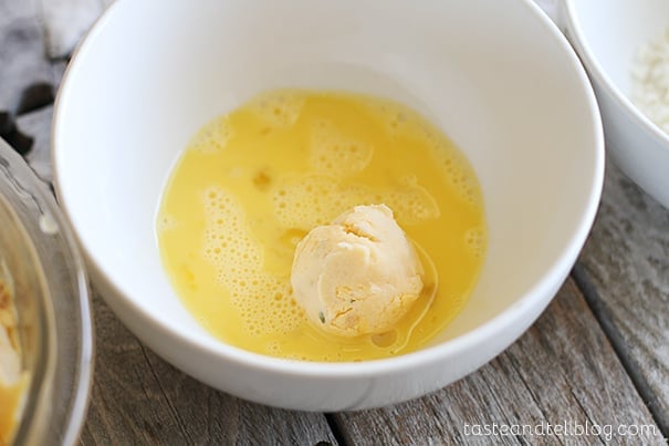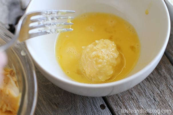 You are going to do a double coating to make sure the potatoes stay inside, so start by dipping the balls of mashed potatoes in the egg.