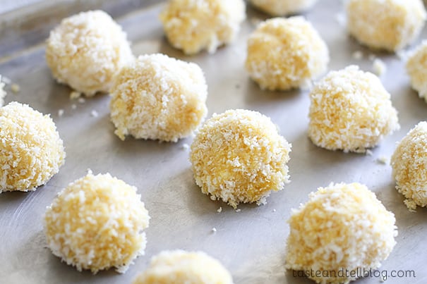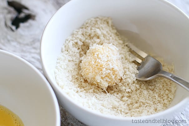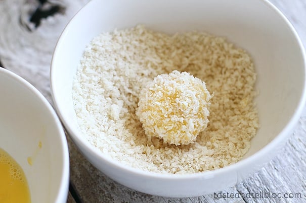 Place the balls on a baking sheet, then refrigerate them for at least 30 minutes. You could make these well ahead of time and refrigerate them until right before you want to fry them.