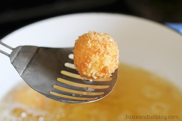 - Heat about 2 inches of oil in a Dutch oven or heavy bottomed pot. Fry the balls in batches in the hot oil until crispy and brown, 3-4 minutes. Remove to a paper towel lined plate to drain. Serve warm.