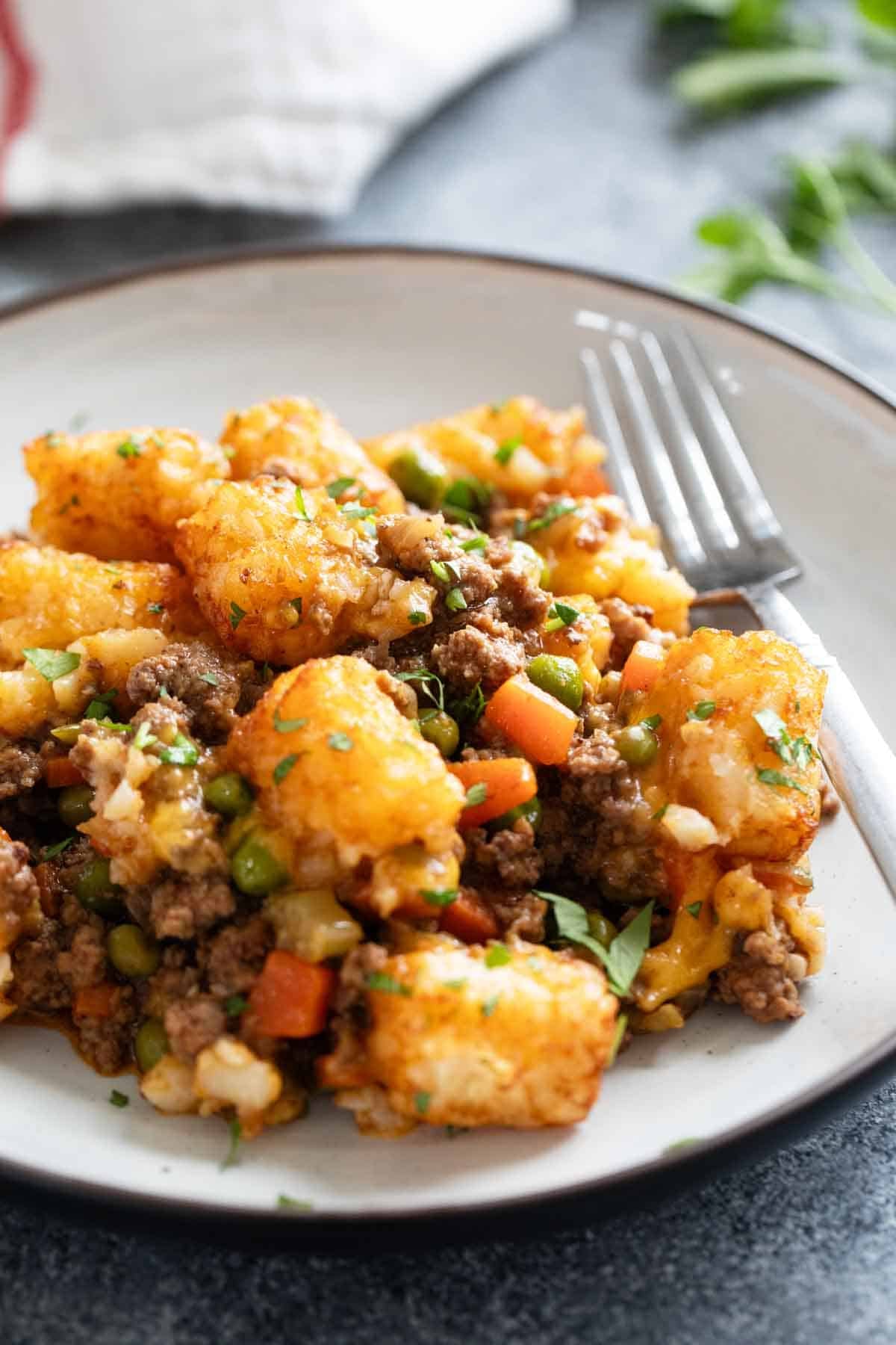 You have that creamy, beefy filling that we all love from a shepherd’s pie. (And yes, I know this is technically a cottage pie because it’s beef, but I’ve always called it shepherd’s pie so we’re sticking with it!) But instead of the creamy mashed potato topping, you get tater tots. They get nice and golden and crispy and the combination is perfect.