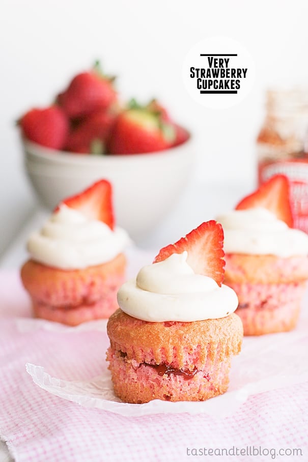 Strawberry cupcakes are filled with strawberry jam then topped with a strawberry cream cheese frosting.
